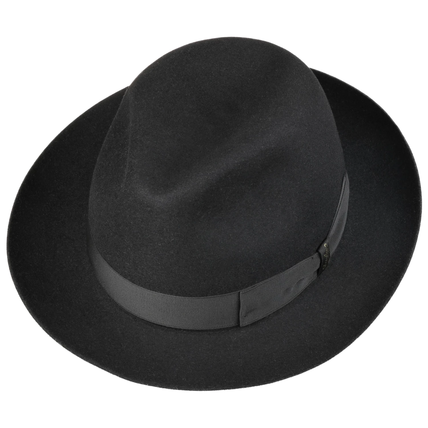 Tiefe Kniffe und eine am Rand galant nach oben gewölbte Krempe prägen die schwungvoll anmutende Bogartform der sorgfältig verarbeiteten Kopfbedeckung. 100% erlesenes Haarfilz vom Kaninchen und ein angenehm geschmeidiges Futter mit hohem Viskoseanteil bieten einen herausragenden Tragekomfort.
