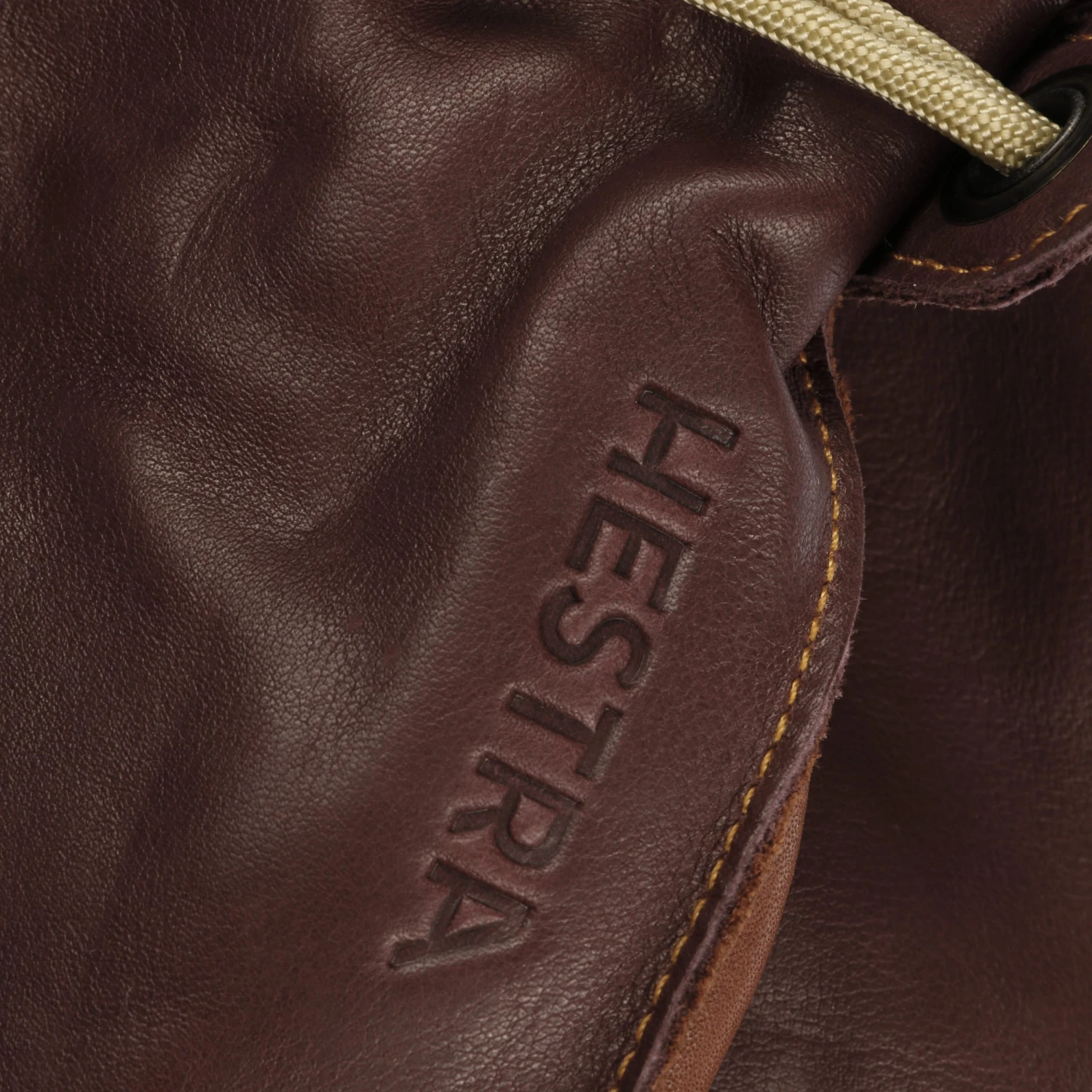 Geschmeidiges Rinderleder, das mit dem Tragen immer knautschbequemer wird, formt sich zu den Fingerhandschuhen mit der Markenprägung von Hestra.