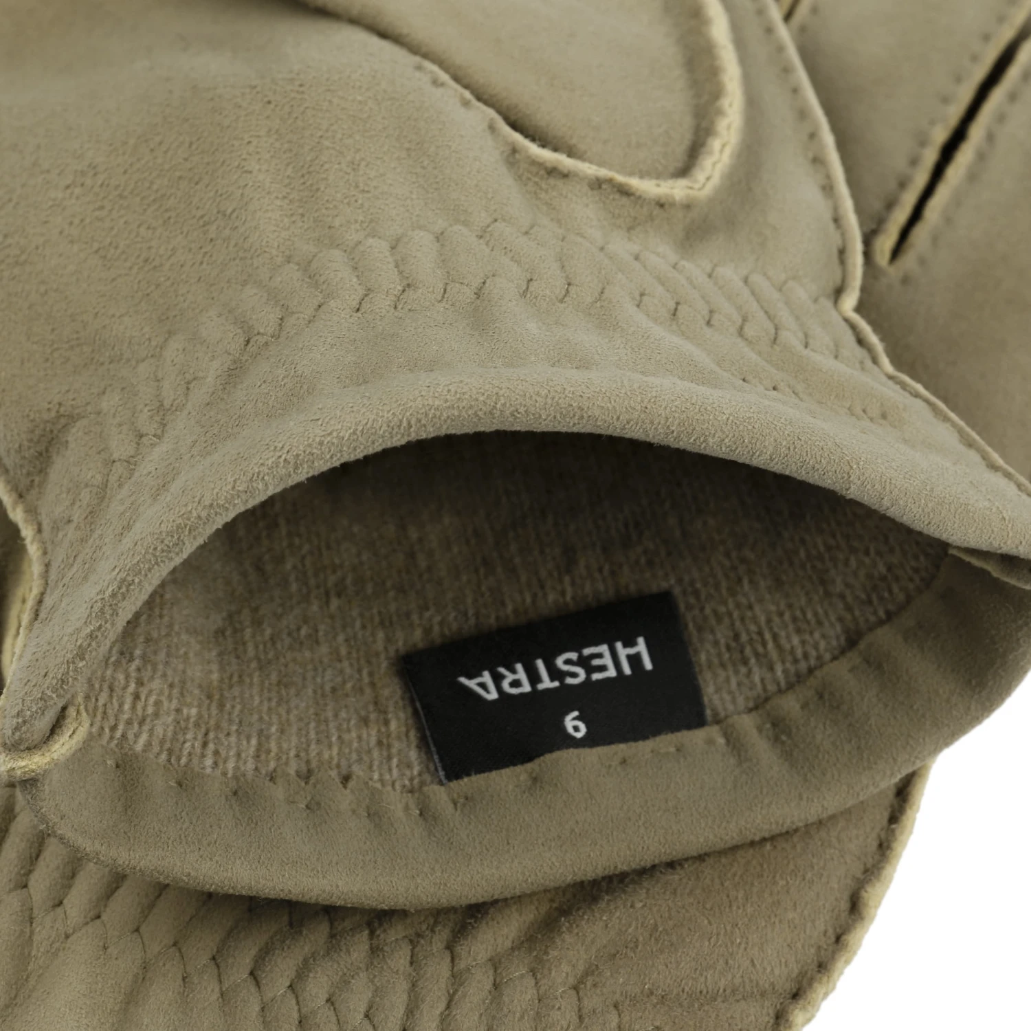 Gefertigt aus 100% Leder, schmiegen sich die unifarbenen Handschuhe von Hestra dank Raffungen an den Bündchen passgenau um die Handgelenke.