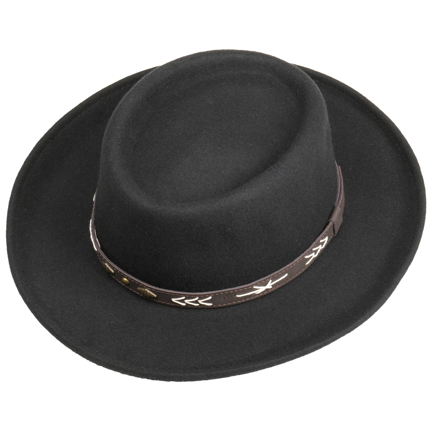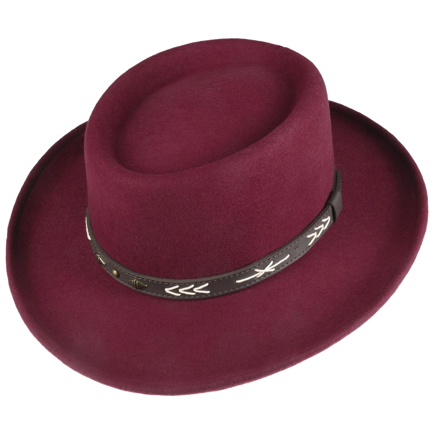 Innen schmiegt sich ein baumwollenes Schweißband für optimierten sommerlichen Tragekomfort an und in einer kleinen Tasche sind Wertgegenstände sicher verborgen aufbewahrt. Der unifarbene knautschbare Filzhut hat sich gegen Sonne und Regen gewappnet und mit einer Garnitur aus Kunstleder geschmückt, die mit Kordelverzierungen und Metallemblemen markante Extras aufweist.