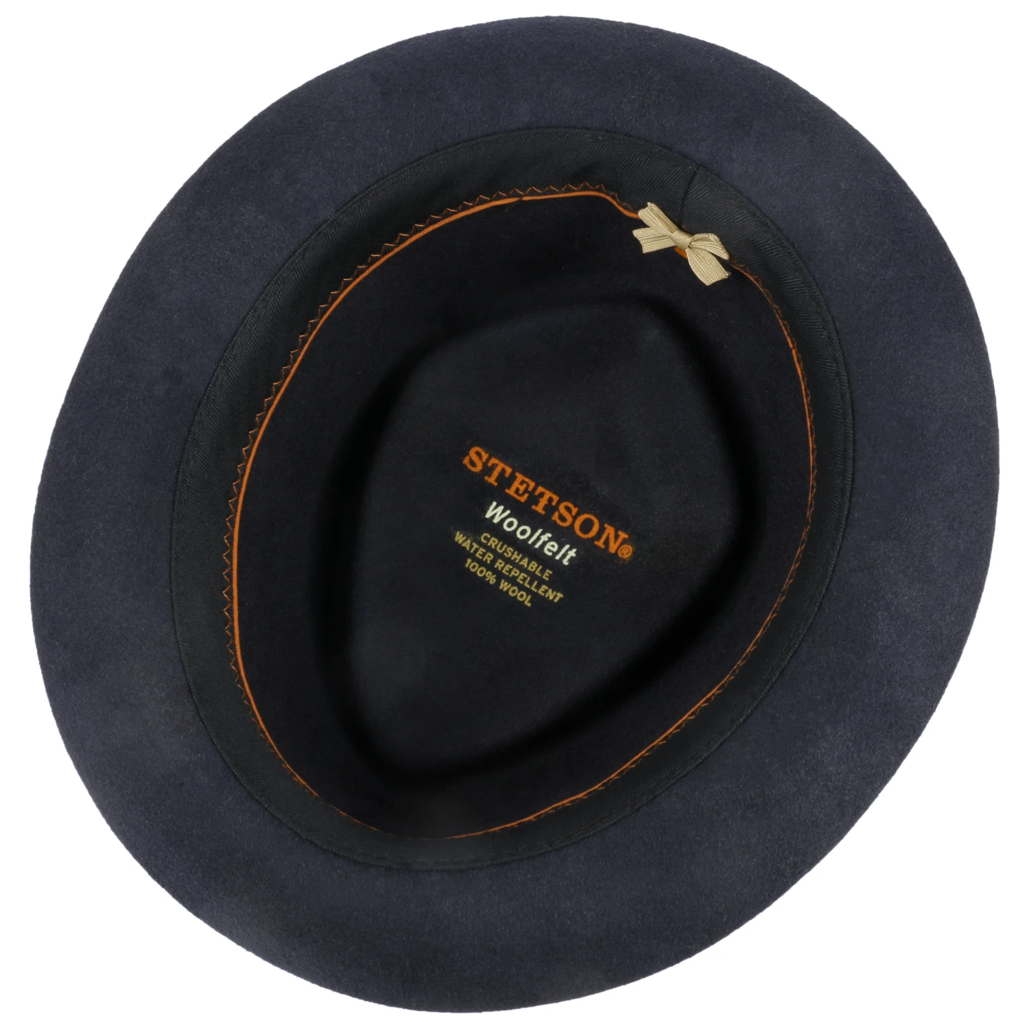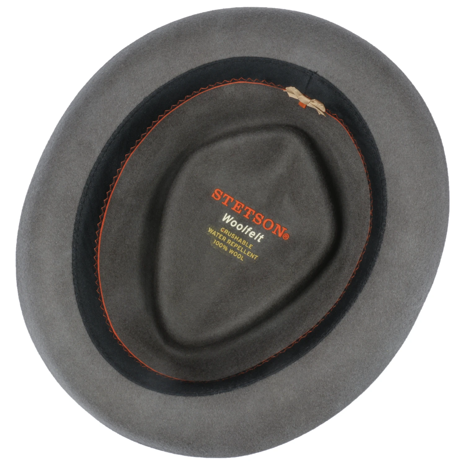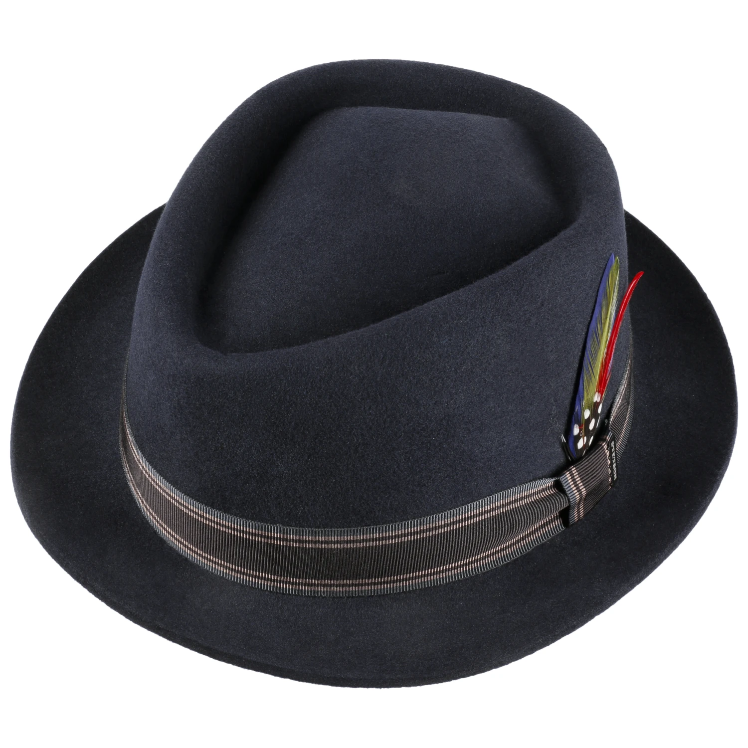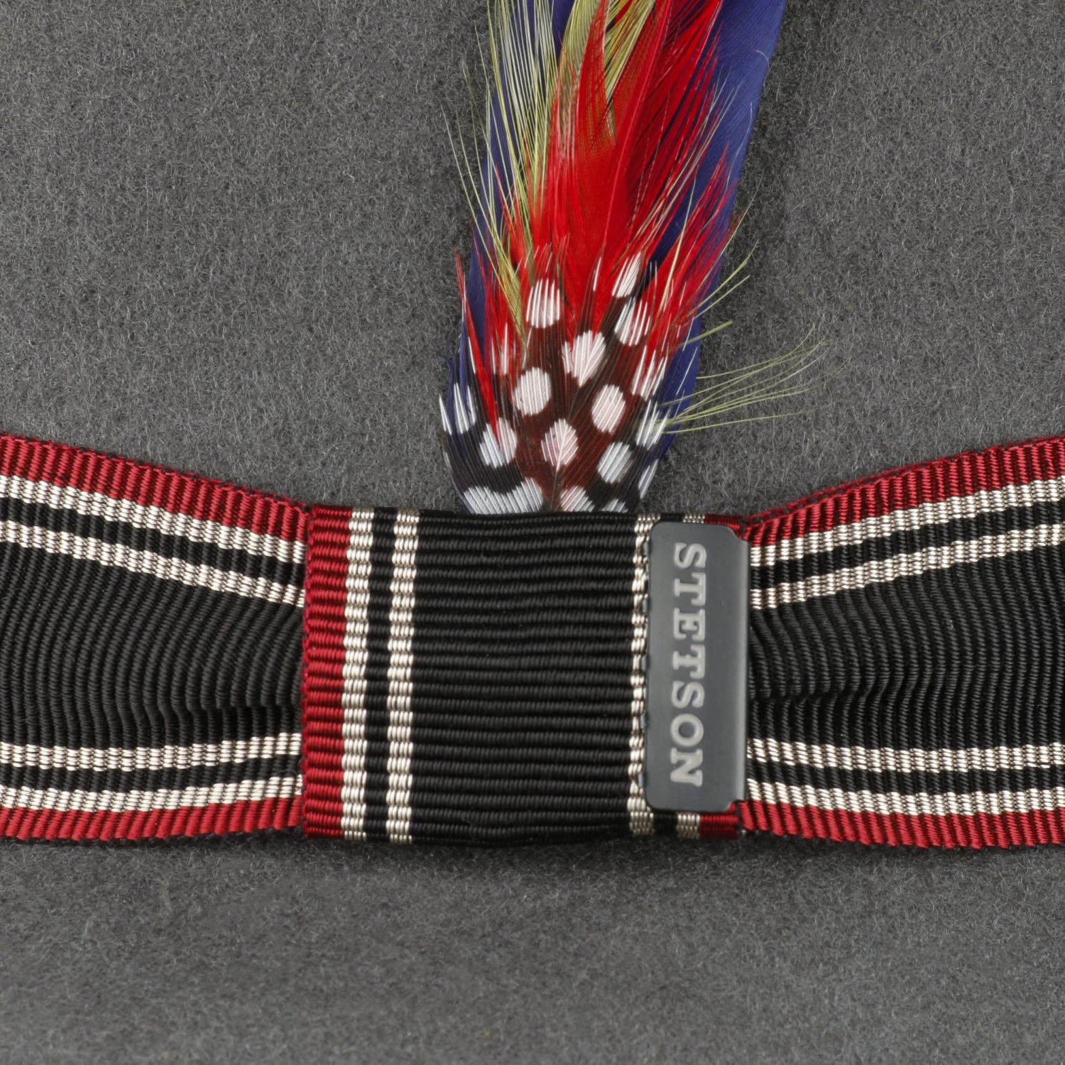 Der exklusive Pork Pie von Stetson ist zu 100% aus Wolle gefertigt und sorgt mit seinem Ripsband und der Federapplikation für einen gelungenen Auftritt.