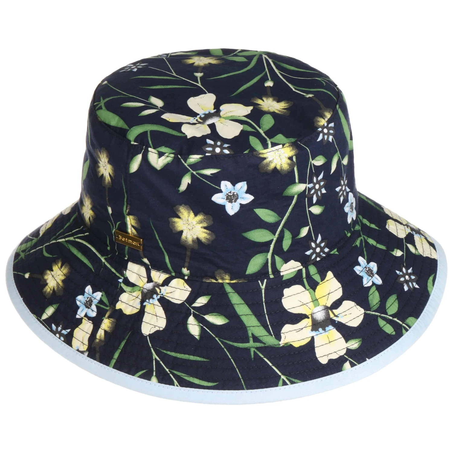 Eine Seite zeigt einen mehrfarbigen Print mit Illustrationen exotischer Blüten. Die andere Seite präsentiert sich klassisch einfarbig. Der Look des Fischerhutes kann ganz nach Bedarf schnell und unkompliziert gewechselt werden.