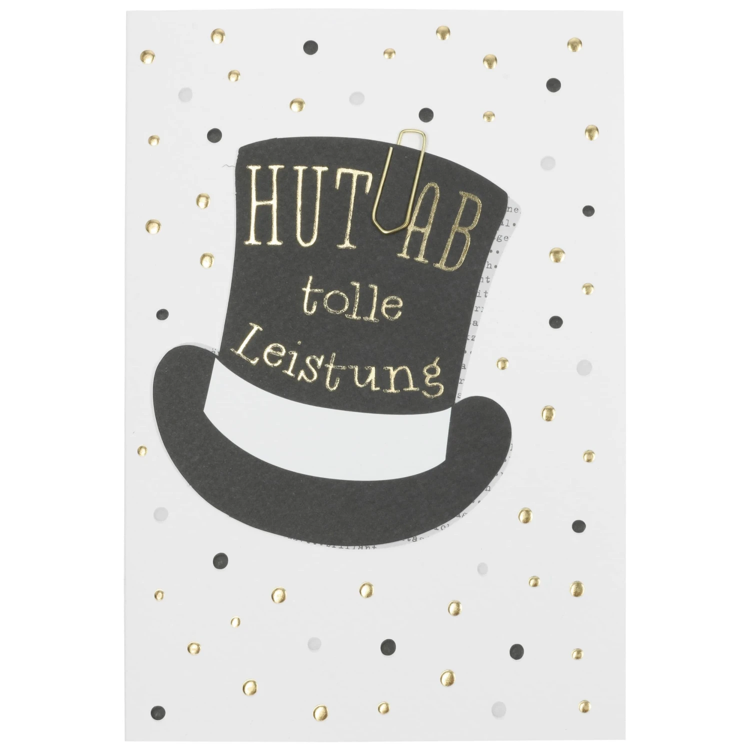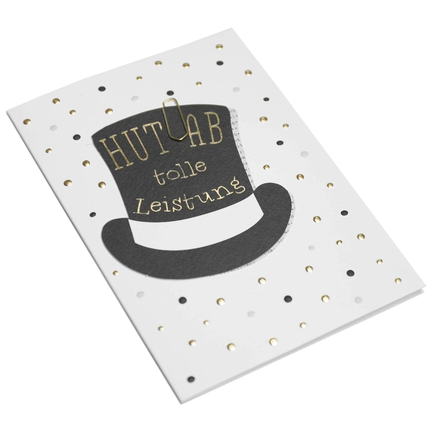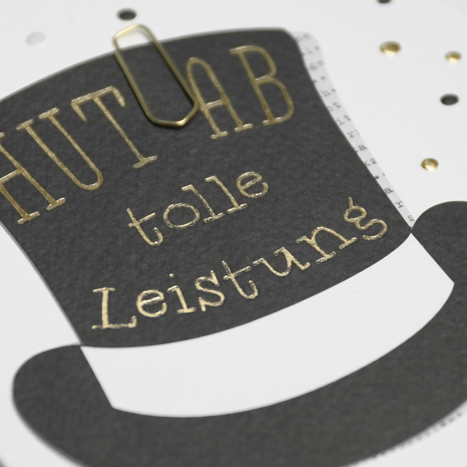 Sobald die handgefertigte Gratulation mit der Beschriftung „Hut ab“ übergeben wurde, kann die wohlverdiente Feier steigen. Später sind Hut und Karte tolle Erinnerungsstücke an den großen Tag. Durch den neutralen Spruch natürlich auch zu anderen Anlässen als der Promotion geeignet.