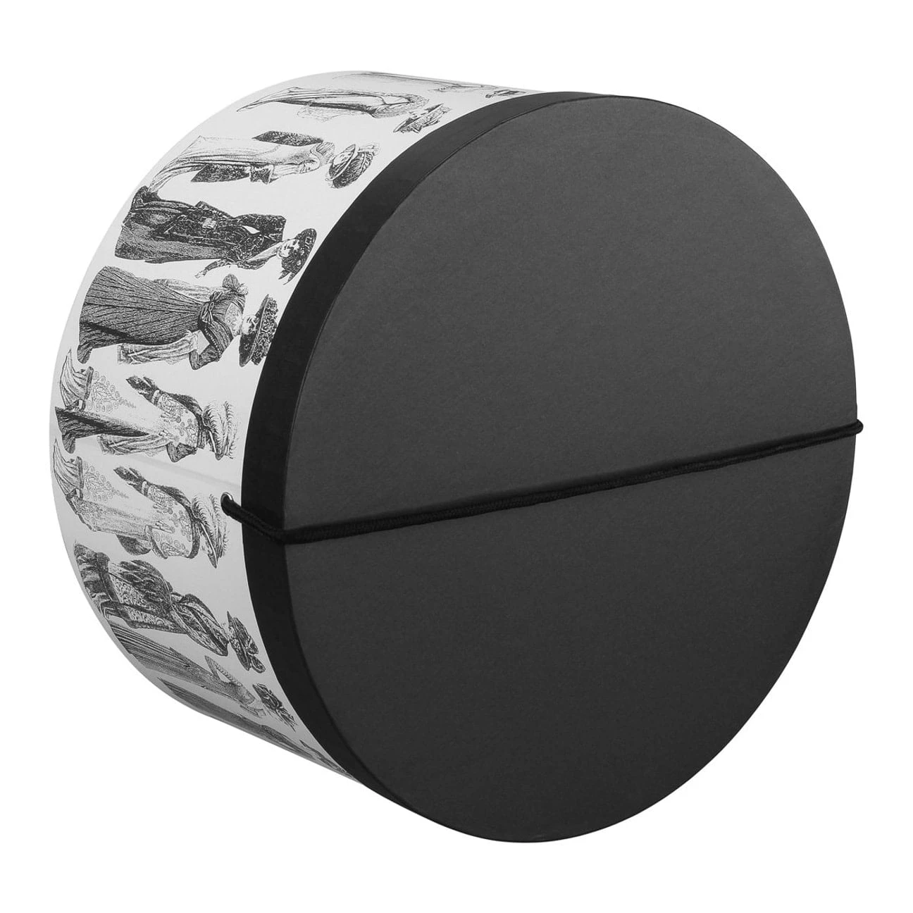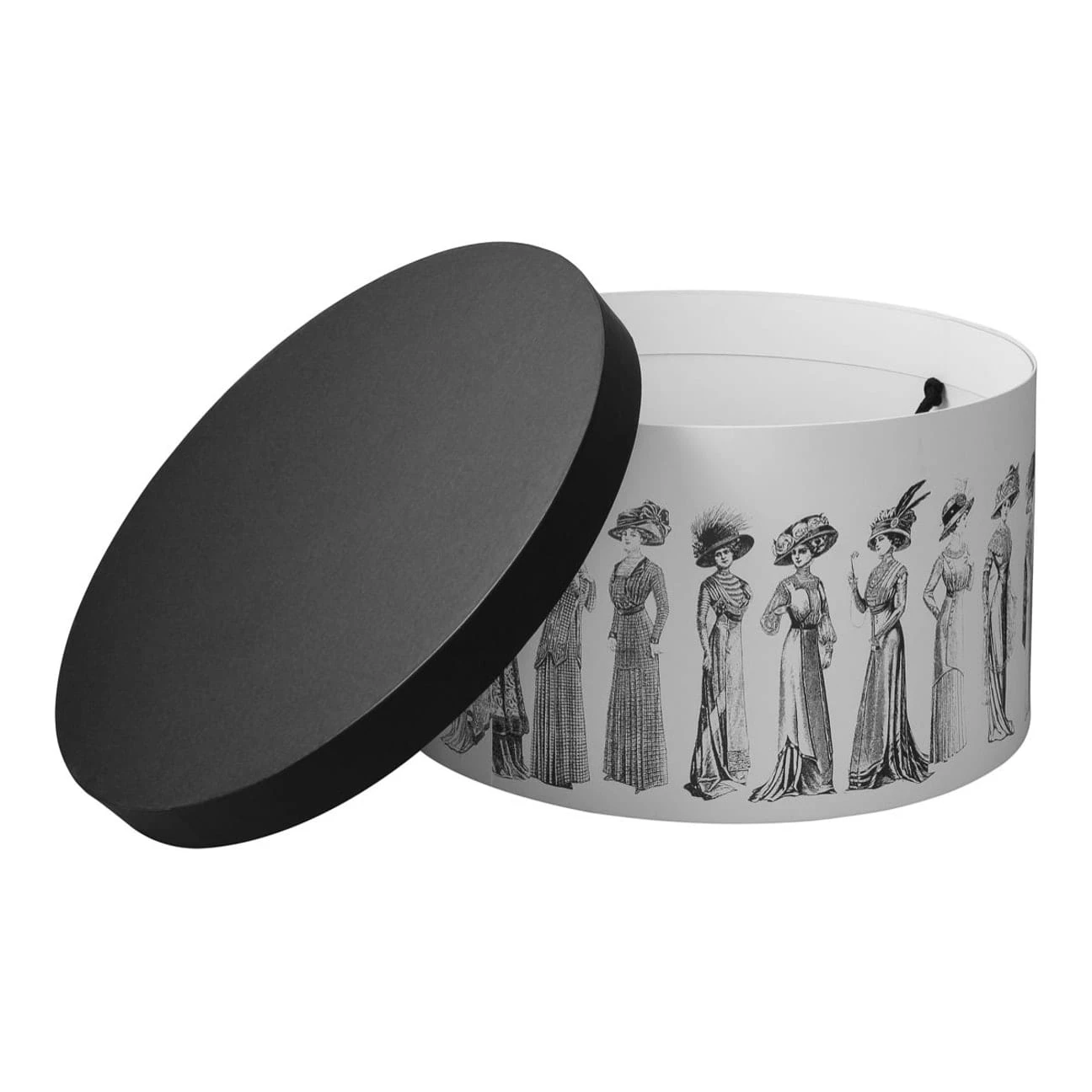 Die formstabile Hutbox wird von feinen Schwarz-Weiß-Zeichnungen vornehmer Damen geschmückt, die allesamt extravagante Anlasshüte tragen.