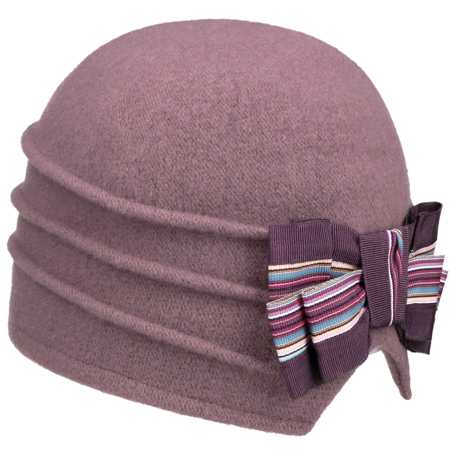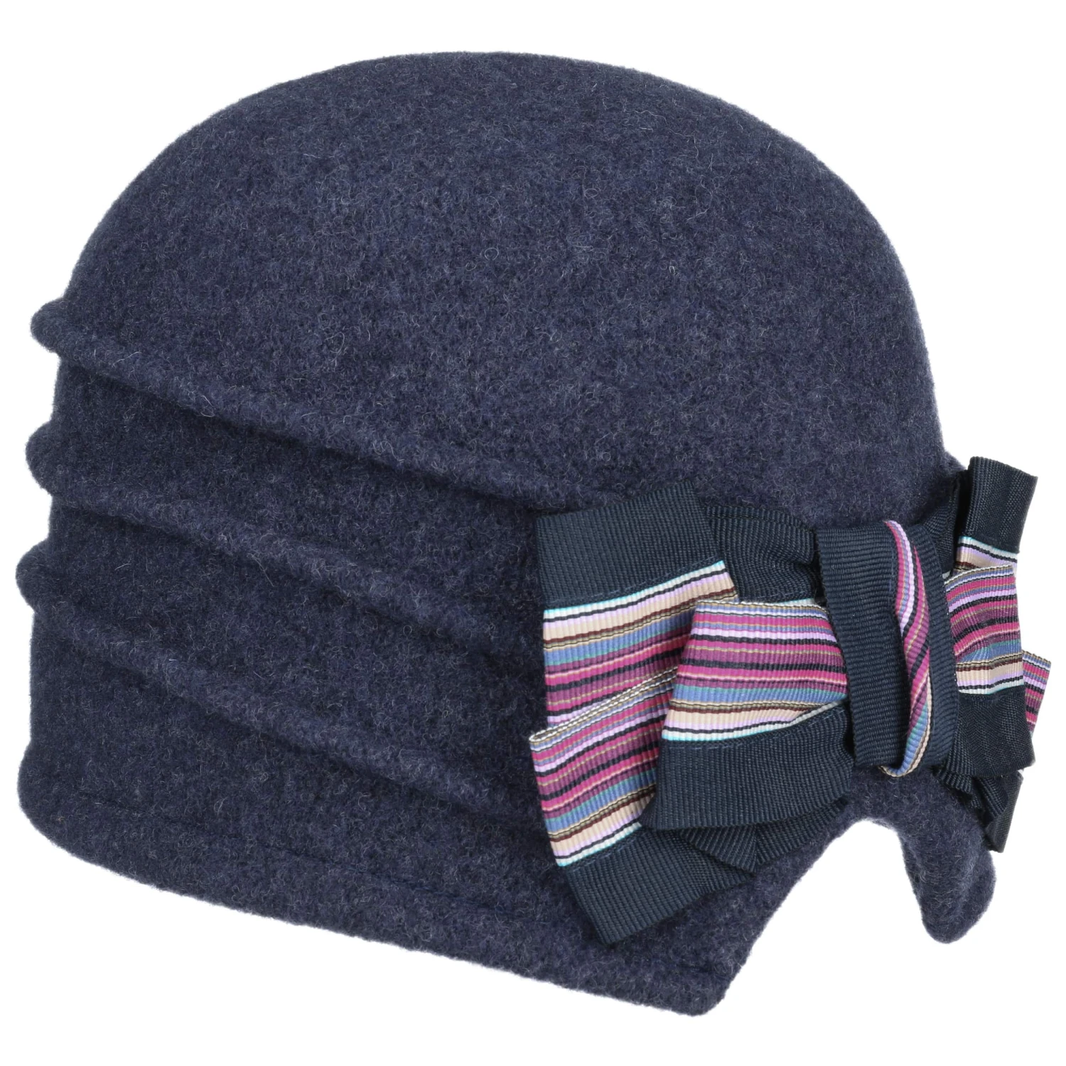 Als attraktiver Blickfang des Designs präsentiert sich eine große Schleife. Die Applikation setzt sich optisch kraftvoll vom Rest der hochwertigen Kopfbedeckung ab. Dabei kontrastiert nicht allein die Farbigkeit, sondern auch das feine Streifenmuster mit dem dezent einfarbig gestalteten Material der Damenmütze.