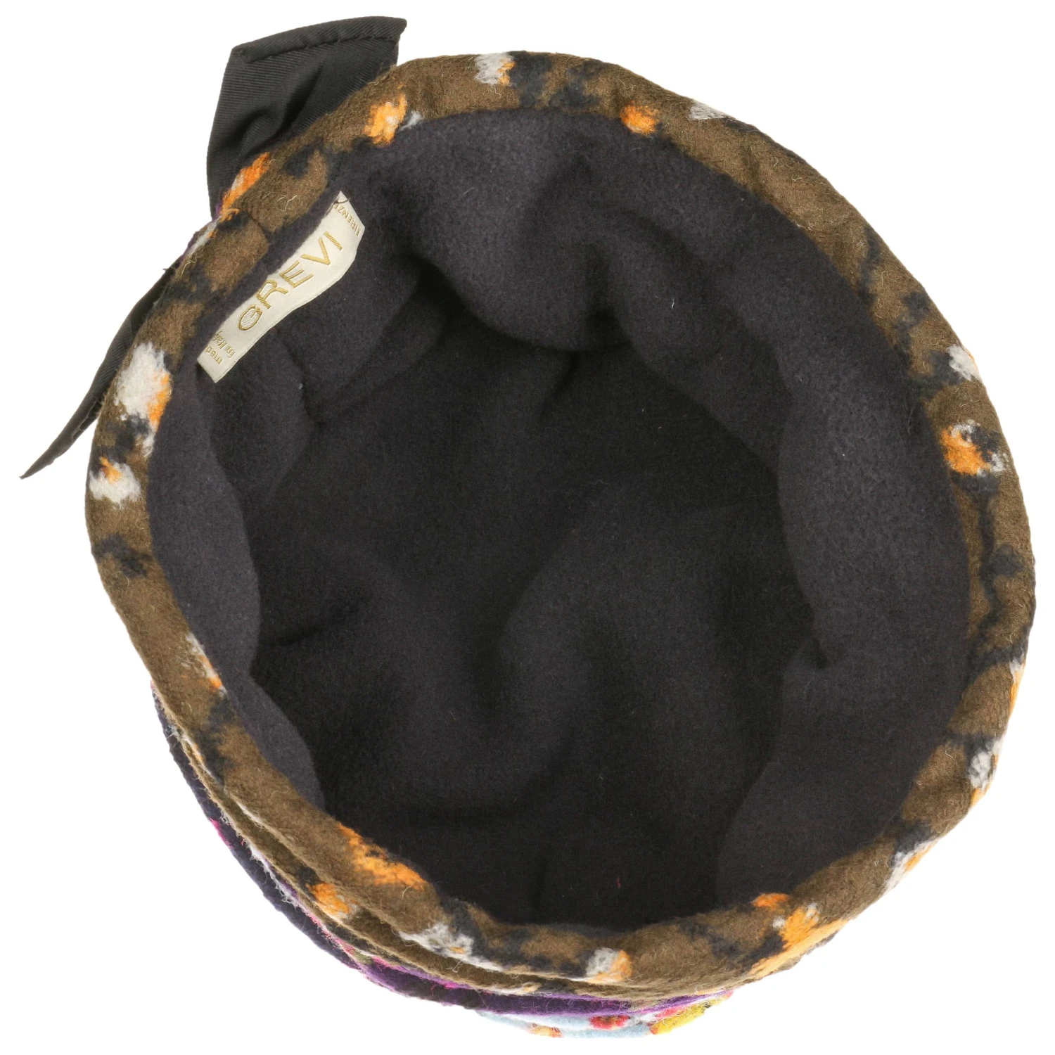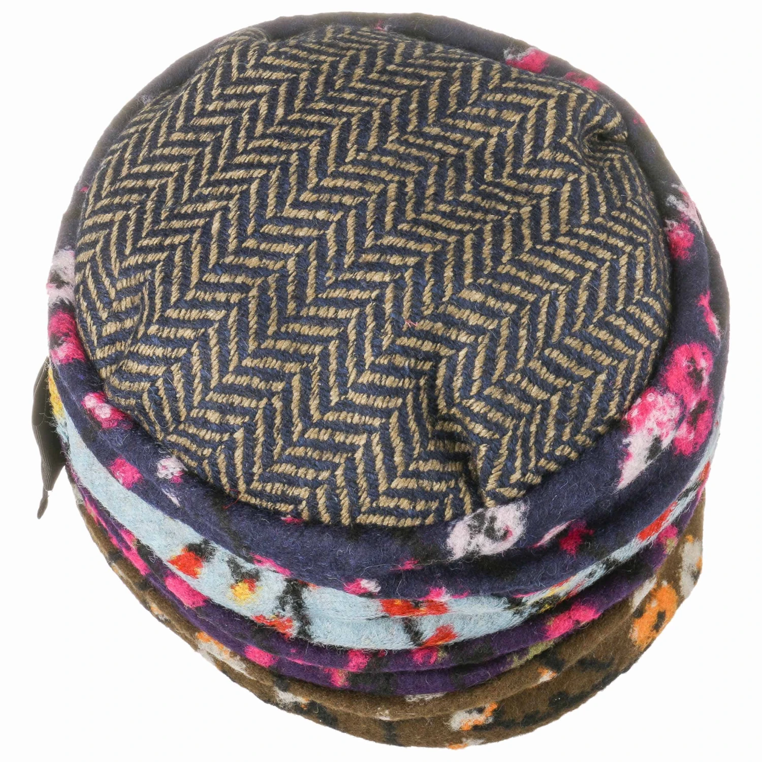 Unterschiedlich geblümte Stoffbahnen fügen sich zu einem fröhlichen Patchwork zusammen. Am Hinterkopf setzt eine große Schleife einen weiteren femininen Akzent. Abgerundet wird das Design der Damenmütze durch ein glänzendes Fischgrätmuster am Oberkopf. Der flauschige Materialmix mit Wolle lässt den Kopf auch an kalten Tagen nicht auskühlen.
