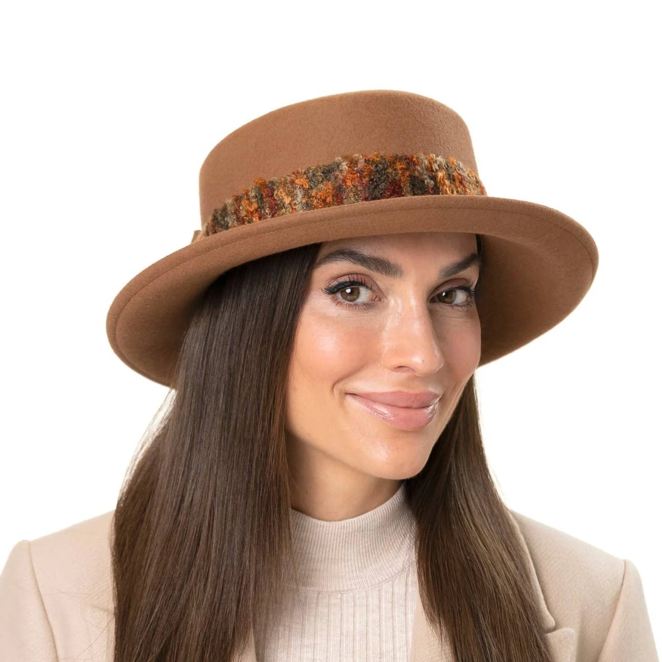 Geschmackvoll sind die Töne des üppig breiten Hutbands aufeinander abgestimmt. Elegant sind runde Krone und sanft abfallende Krempe zu einer außergewöhnlichen Silhouette kombiniert. Und warm hält das Material aus 100% weichem Wollfilz Kopf, Herz und Ohren. Als besonderes Highlight ist am Hinterkopf eine süße Filzschleife angebracht.