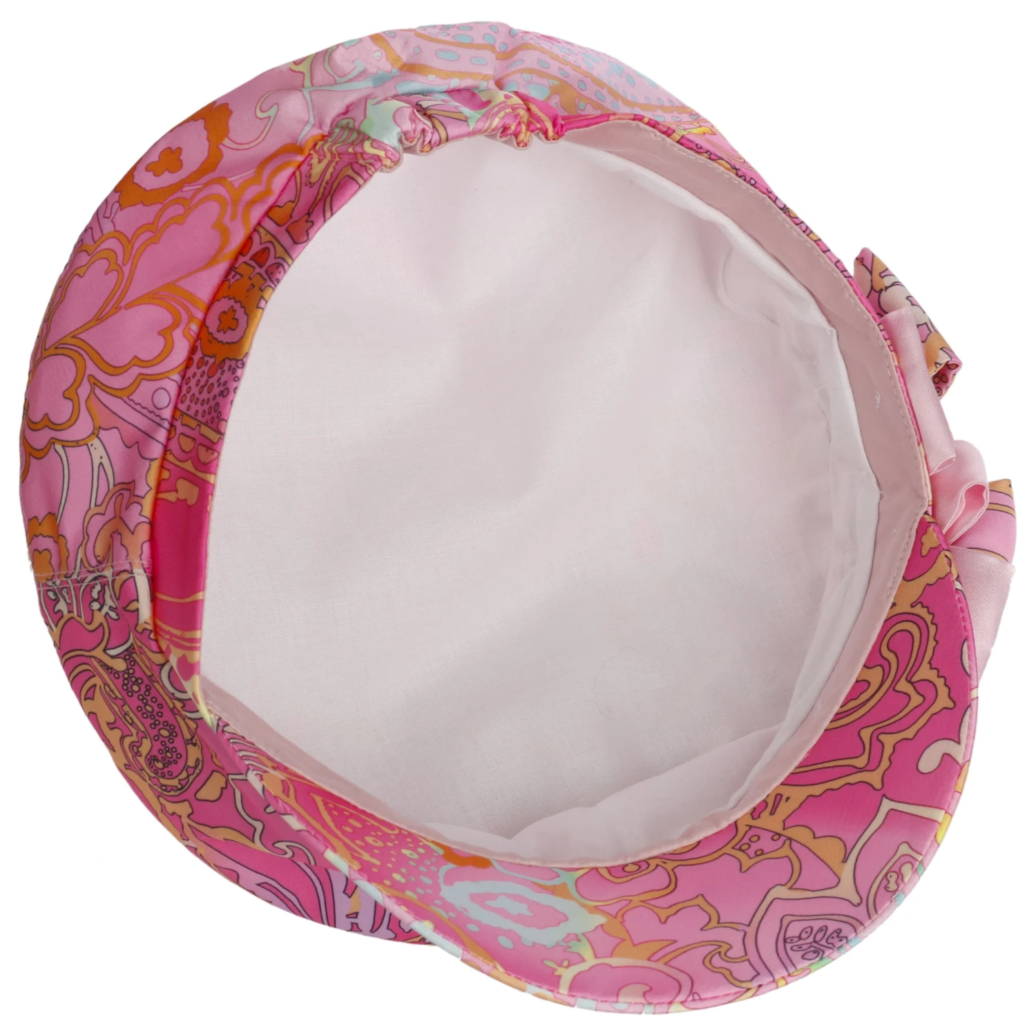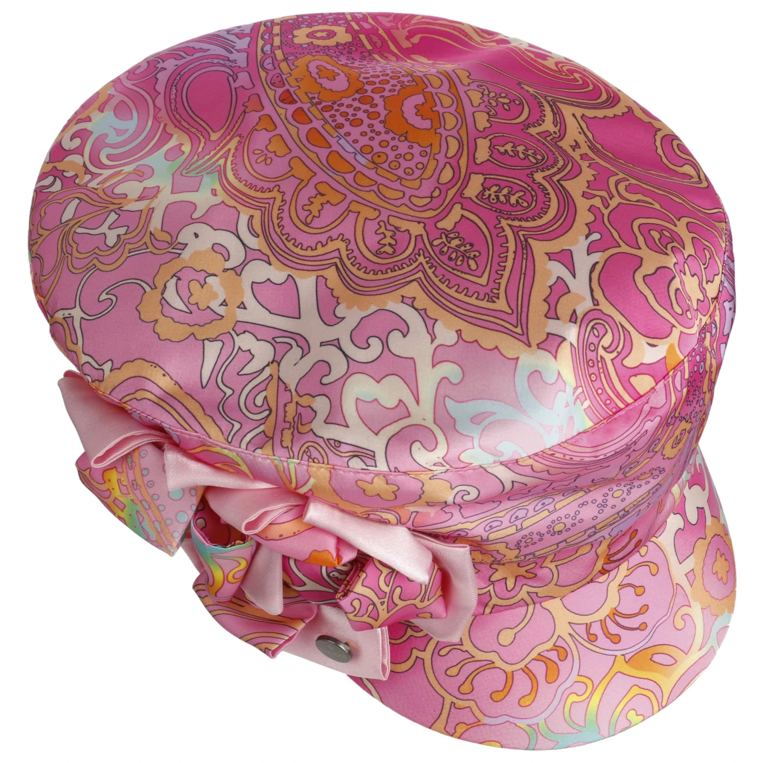 Das glatte Obermaterial aus Viskose und Baumwolle verfügt über einen leichten Glanz, der das fantasievolle Allover-Muster hervorragend zur Geltung bringt. Ein Baumwollfutter sorgt für höchsten Tragekomfort und der Stretchgummizug hinten für einen optimalen Sitz. Die Schirmmütze ist sehr detailliert gearbeitet und seitlich mit einer Stoffapplikation versehen.
