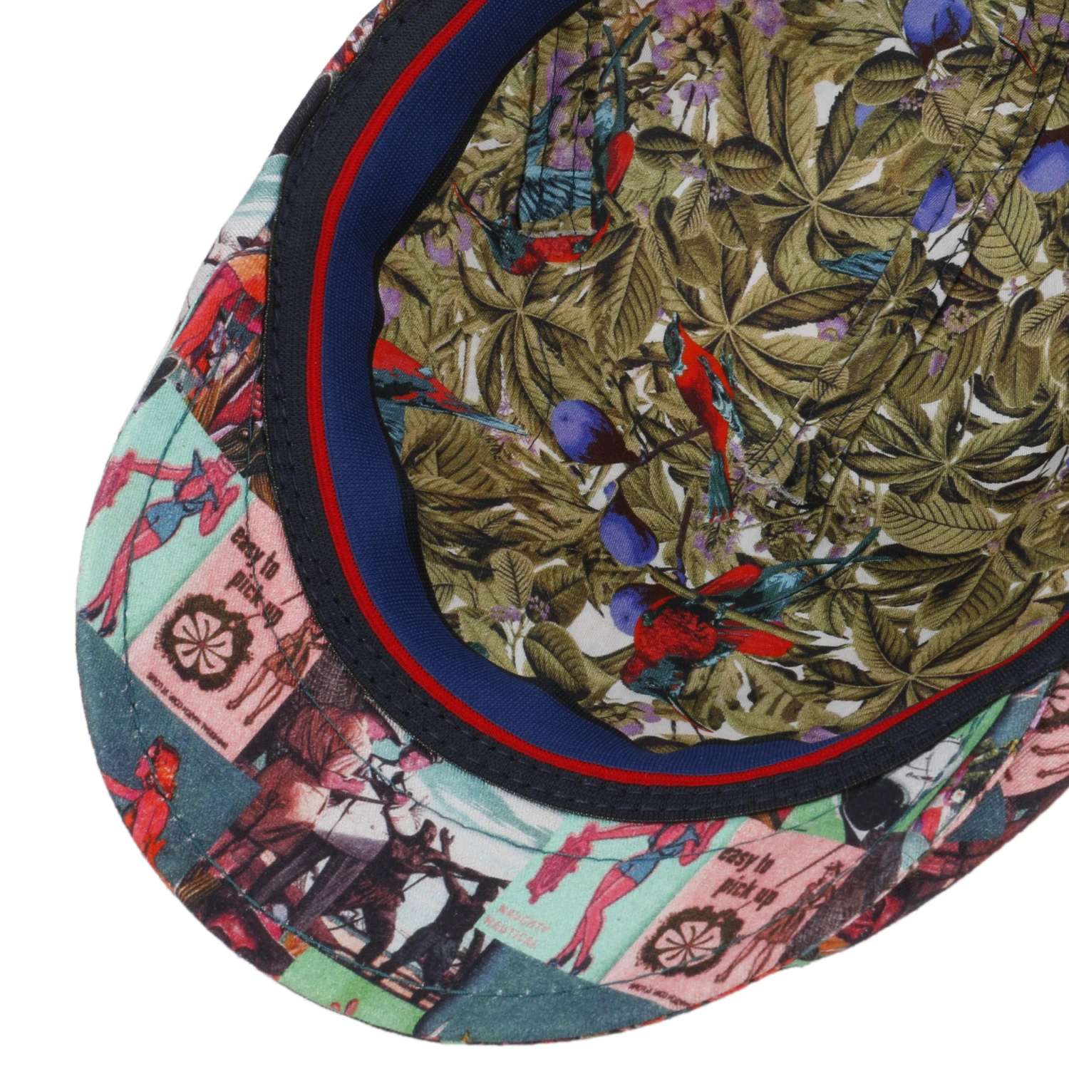 Sie fällt durch ihr originelles Design auf. Eine bunte Collage im Retro-Stil ziert das Obermaterial der sommerlich leichten Kopfbedeckung. Bild für Bild reihen sich Pin-ups, Alltagsszenen und Urlaubsmotive im Retro-Stil aneinander. Die hohe Qualität des bedruckten Stoffs macht die sorgfältig verarbeitete Mütze mit Schirm zum textilen Kunstwerk.
