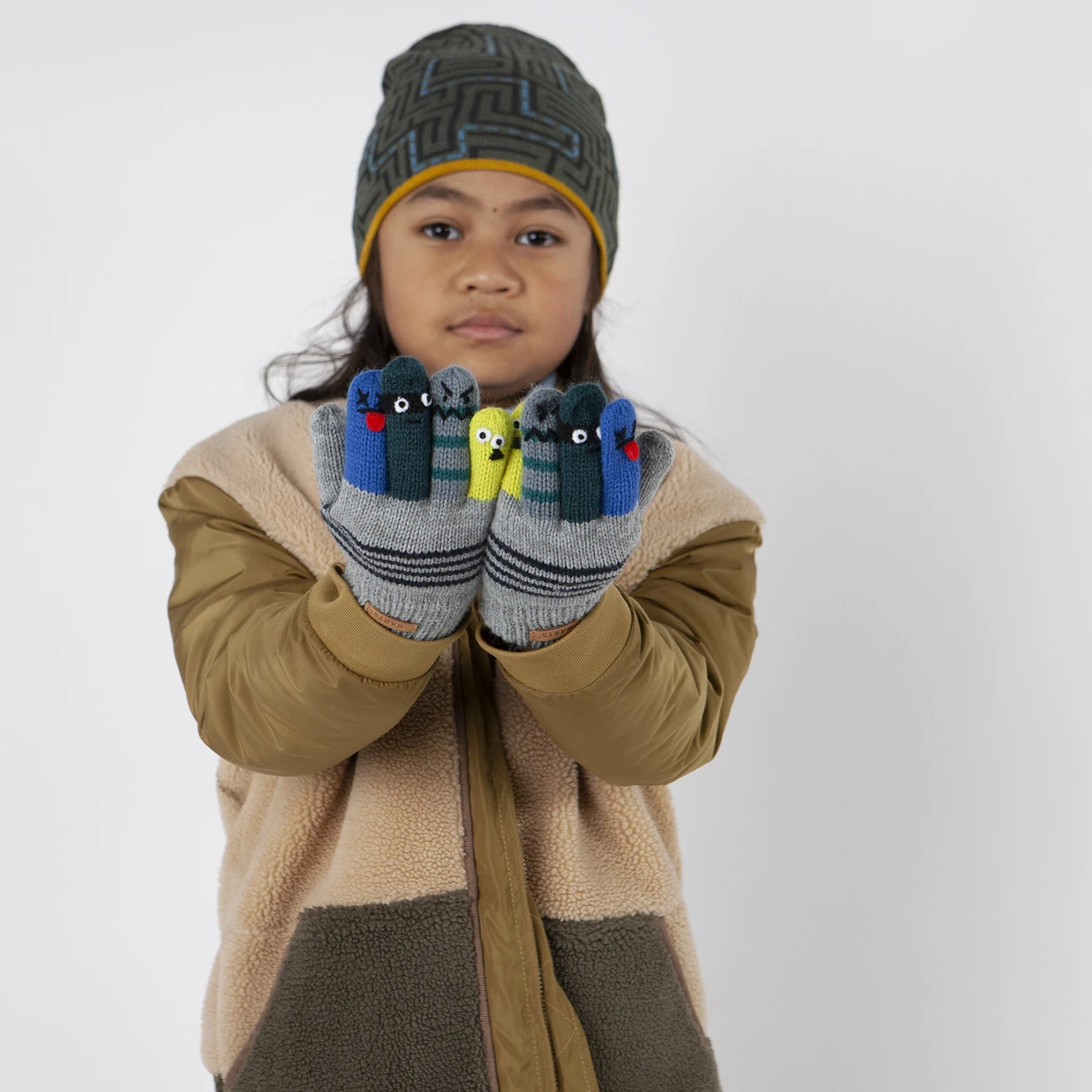 Jeder einzelne Finger wurde mit einem anderen Monstergesicht verziert, sodass gleich beim Hineinschlüpfen in die Strickhandschuhe gute Laune entsteht.