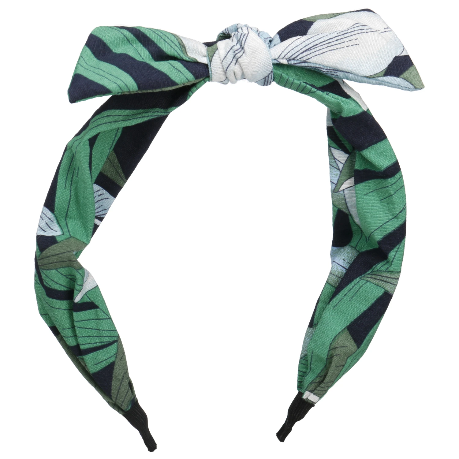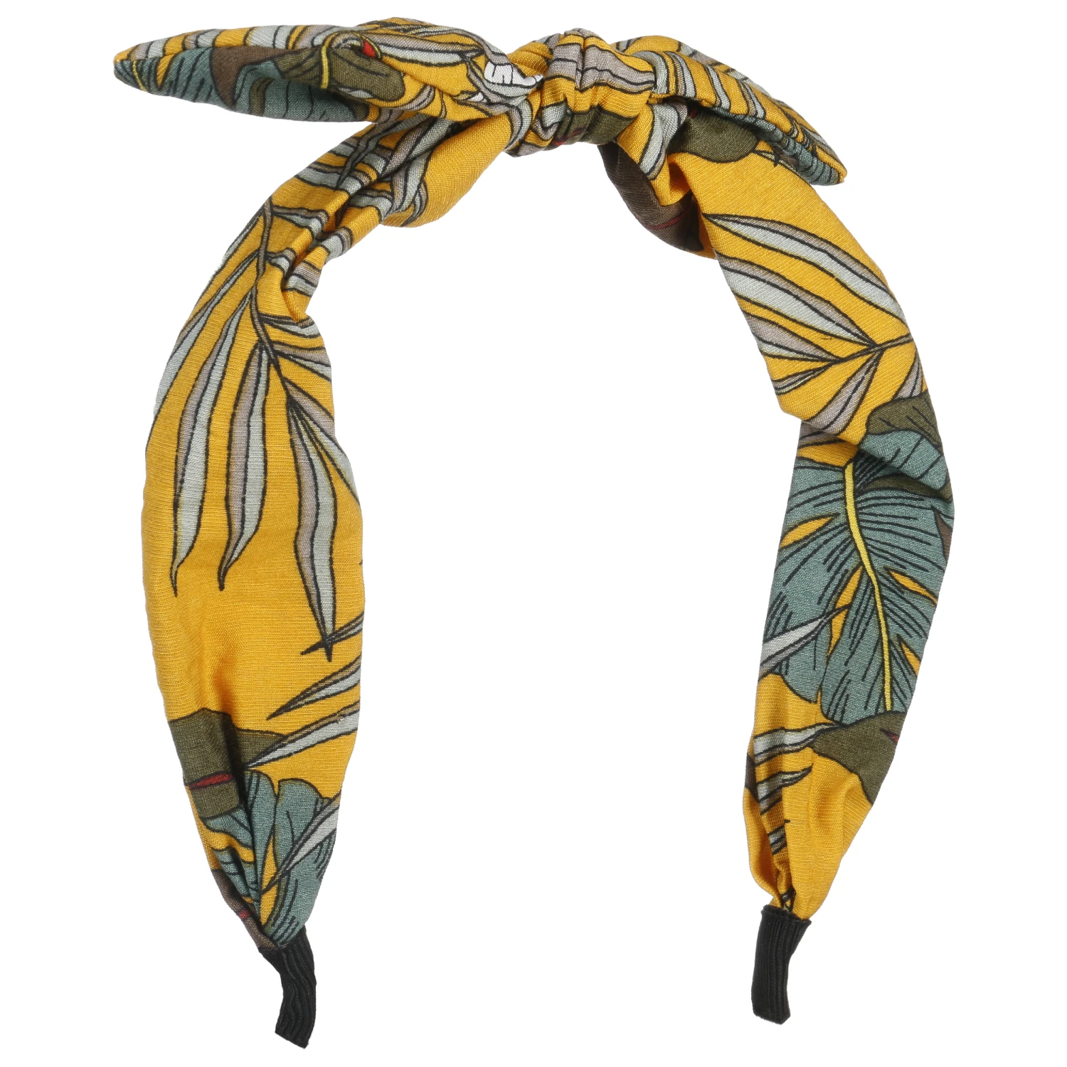 Tatsächlich ist das Modell ein Haarreif. Der Vorteil: ein stets akkurater Sitz, ohne Mühe. Das locker um den Reif gelegte Gewebe zeigt einen sommerlich anmutenden Print, der mit kontrastierenden Farben auf sich aufmerksam macht.