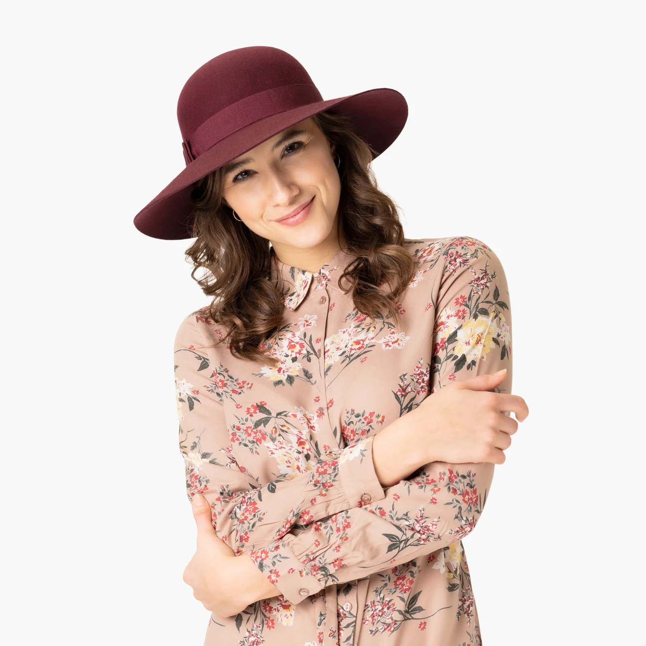 In unifarbenem Design kommt die harmonisch runde Krone des Filzhuts besonders gut zur Geltung, darunter breitet sich ausladend die geschwungene Krempe aus – perfekt für einen verführerischen Augenaufschlag.