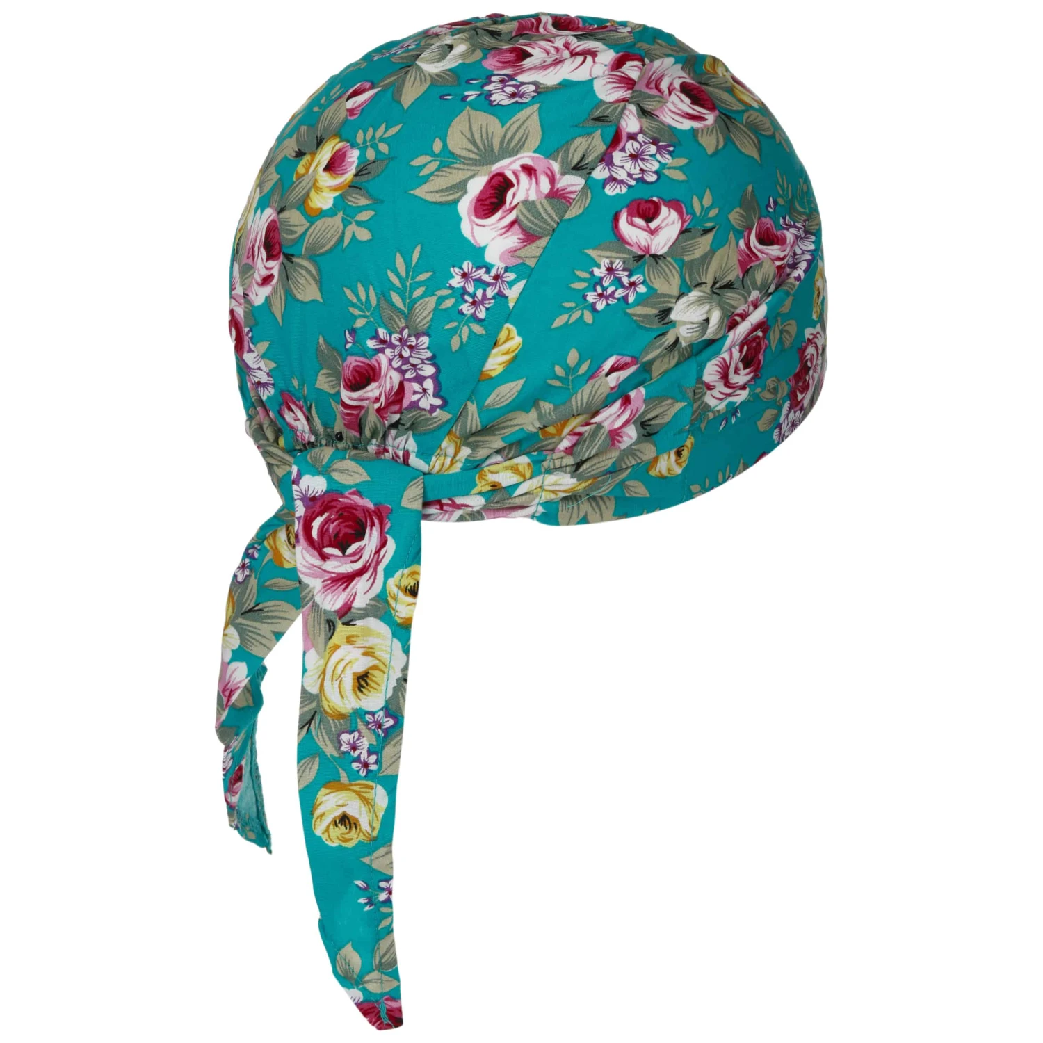 Tonige Steppnähte halten das geblümte Kopftuch mit hinten verknoteten Enden perfekt in Form. Das luftig-leichte, funktionale Accessoire schützt den Kopf vor Wind und Sonne. Es rundet modische Sommer-Outfits perfekt ab. Ausgezeichnet passt es beispielsweise zu einem unifarbenen Jumpsuit oder Kleid.